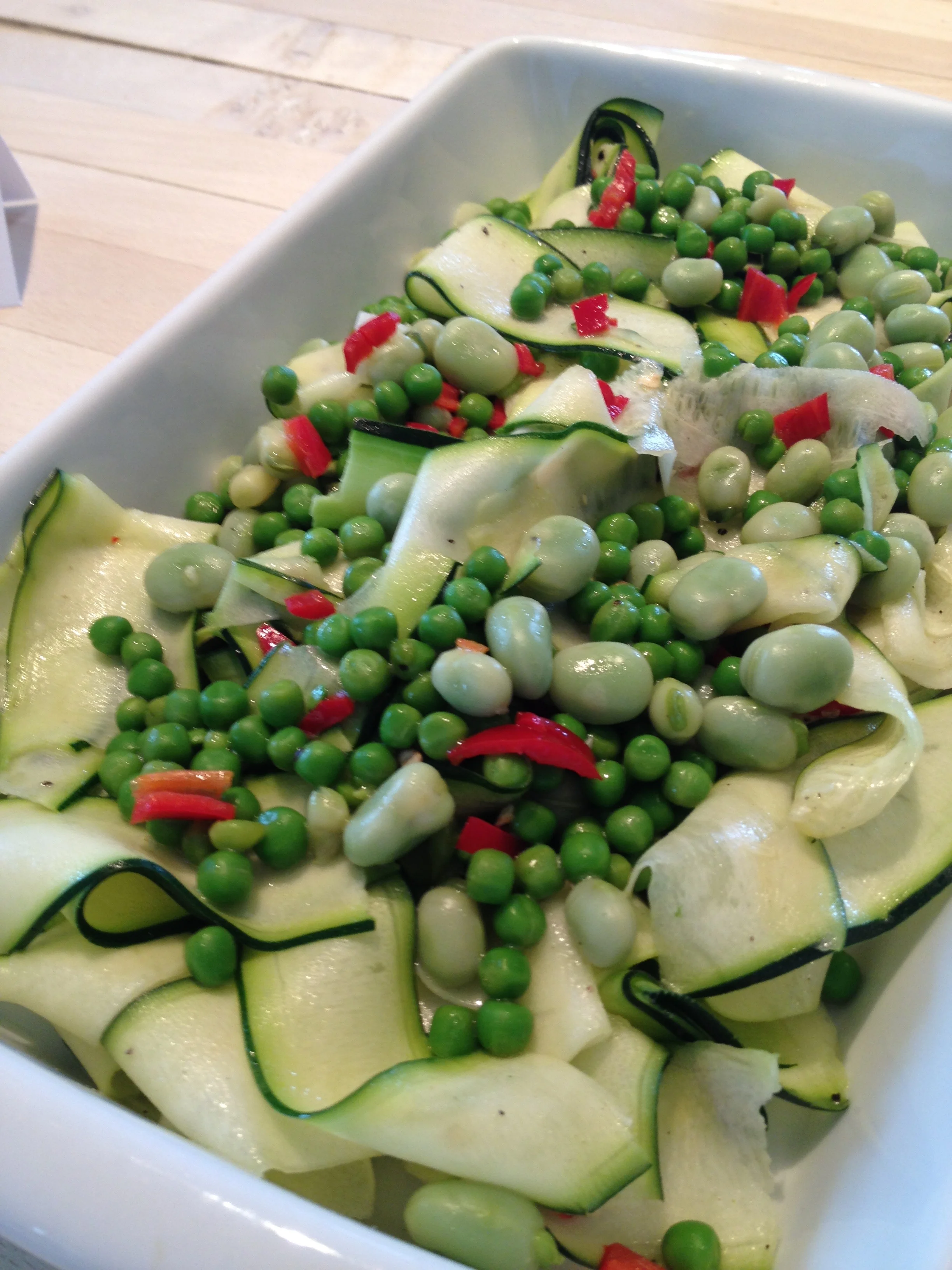 Slice 4 courgettes lengthways as thin as you can (use a mandolin if you have one). Grill on a red-hot griddle pan until lightly charred on each side. Scatter the slices over a large plate, making sure you don't sit them on top of each other otherwise they'll steam and go limp ! While they're still warmish, sprinkle them with a little sea salt and freshly ground black pepper.